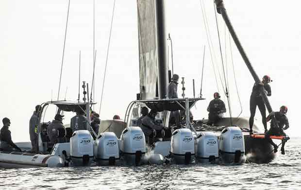 Per darvene un’idea vi faccio vedere qui sotto una foto di Luna Rossa affiancata da due “gommoni di addestramento”, che servono per valutare, affiancandosi all’imbarcazione nelle sessioni di prova, le strategie e le tecnologie. Ebbene, ogni gommone, per stare dietro a Luna Rossa, è dotato di motori da 750 hp.