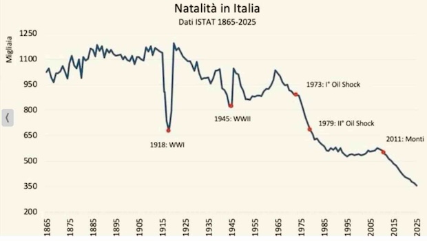 L’indice di fertilità femminile rappresentato dal numero di figli per donna in Italia nel 2025 è ulteriormente disceso da 1,18 a 1,14, registrando il più basso indice in Europa (media UE 1,34, ,Germania 1.34, Svezia 1,43 e più in alto la Francia con 1,69).