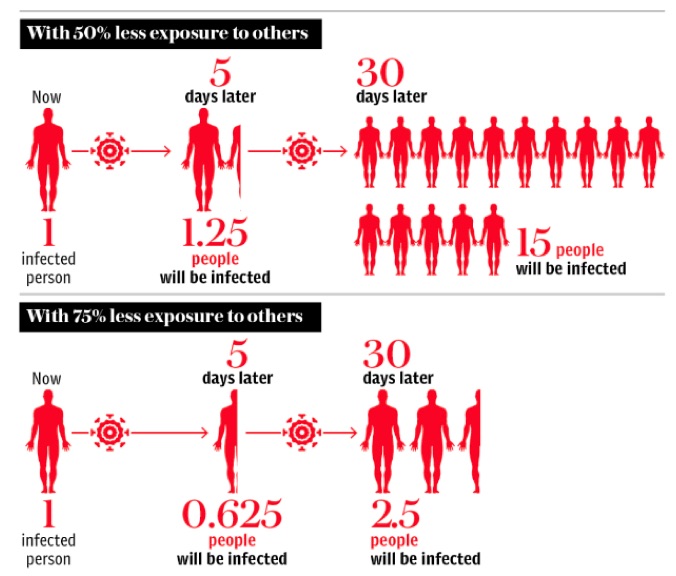I grafici parlano di “less exposure = meno esposizione”; cosa significa ? Attualmente, alle persone viene chiesto di mantenere una distanza di circa 2 metri quando sono fuori; ad esempio in coda ai supermercati; e alcuni di questi esercizi hanno marcato delle linee di nastro adesivo sul pavimento, per garantire un'adeguata separazione tra gli acquirenti durante la fila.