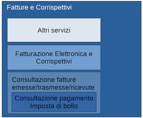 L’Applicativo Fatture e Corrispettivi presenta diverse sezioni e diversi servizi, nell’immagine sottostante ho evidenziato le principali sezioni necessarie per la generazione e la trasmissione (Fatturazione Elettronica e Corrispettivi) o il monitoraggio delle fatture elettroniche (Consultazione fatture).