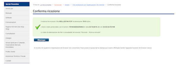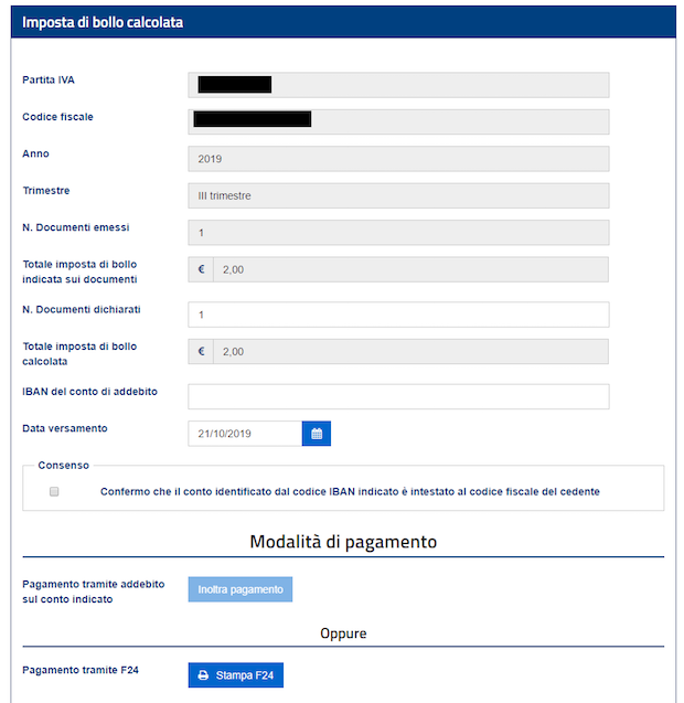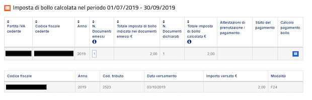 Prima di entrare nel vivo della parte operativa, vorrei segnalare che il problema da me riscontrato riguardante l’applicativo Fatture e Corrispettivi che non mostrava il dovuto per i bolli delle fatture elettroniche del precedente trimestre è stato completamente sistemato e da questo mese (Ottobre 2019) visualizzo correttamente sia il dovuto che il pagato.