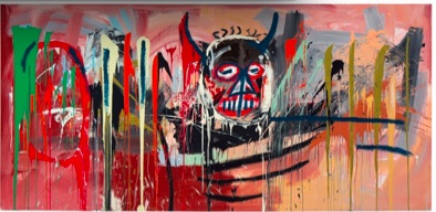 L'artista americano Jean-Michel Basquiat, col suo dipinto del 1982 'Untitled' (riprodotto qui di seguito)
