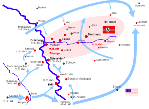 Il 25 Marzo, tre settimane dopo la caduta di Remagen, le forze di Bradley partirono all’attacco delle linee tedesche intorno alla testa di ponte; ancora una volta gli americani si erano mossi con cautela forse eccessiva, ma poi la I Armata avanzò con decisione, puntando a ricongiungersi con la IX Armata di Simpson che aveva attraversato il Reno a Wesel. Bradley non era un fautore delle manovre a tenaglia, ma in questo caso i due passaggi aperti sul Reno rendevano istintivo tentare di accerchiare la Ruhr, annientando quel che restava del gruppo di armate B guidate dal feldmaresciallo Model. I tedeschi non riuscivano ad opporre che una resistenza frammentaria mentre il cappio si stringeva inesorabile; il 15 aprile Model rifiutò la resa, mentre da Berlino giungevano insensati ordini di contrattaccare: il 18 il grosso delle divisioni si arrese; gli americani fecero 300.000 prigionieri, compresi 50 generali. Dopo la resa Model, rivolto al suo capo di stato maggiore: