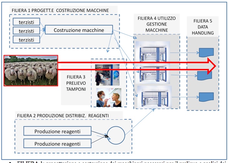 Una figura vale mille parole: questo schema vuole solo dare un’idea delle diverse filiere tecnologiche che potrebbero essere coinvolte nell’iniziativa “tamponi”: l’obiettivo è l’implementazione della “freccia rossa” cioè estrarre dal “gregge” dei cittadini il numero necessario di dati sull’epidemia.
