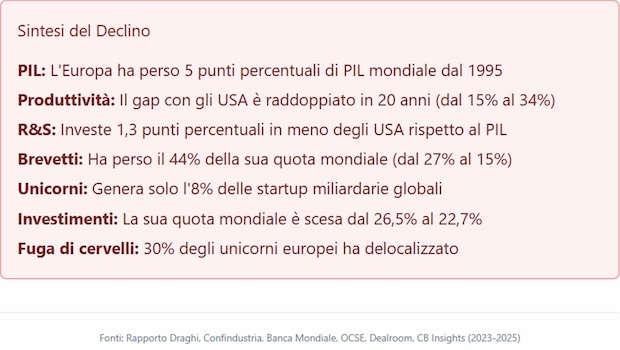 Dietro la compostezza istituzionale si è fatta strada una inquietudine profonda. Il sogno di un continente che unisce i popoli in nome della pace si è trasformato in un apparato tecnocratico che coordina le economie in nome della sicurezza. L'Unione Europea è oggi una macchina efficiente nel produrre regolamenti, ma inefficace nel proteggere ciò che conta. Non protegge il lavoro travolto dalla globalizzazione, non protegge l'impresa dalla concorrenza sleale, non protegge l'identità culturale delle comunità, non protegge nemmeno la propria narrazione fondativa. Ogni crisi la coglie impreparata, e ogni risposta arriva troppo tardi per essere credibile. È un continente che vive come se il mondo fosse ancora quello di Maastricht, mentre fuori tutto è cambiato.