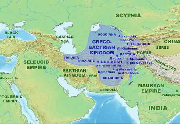 Un ruolo di primo piano lo giocò nei primi due secoli il regno di Battriana, ultimo retaggio dell’impresa Alessandrina, che, affrancatosi dal dominio seleucide, approfitta del declino del regno maurya per estendere verso est la propria zona di influenza, assorbendo elementi della cultura e della religione indiane, ragione per cui divenne un prezioso ponte tra il mondo orientale e l’occidente; la sua vicenda terminò nel 50 a.c, quando dovette soccombere di fronte alle invasioni di nuovi popoli barbari da nord e da ovest, gli sciti ed i parti sassanidi. Non è chiaro cosa provocò le migrazioni di queste popolazioni, sembra che possano essere state conseguenza indiretta della rinata potenza militare cinese dopo l’avvento della dinastia Han, che, respingendo verso nord i barbari Hsiung-nu ( poi noti in occidente come unni), provocò una sorte di reazione a catena, del tutto simile a quella che provocherà la caduta dell’Impero Romano; terrorizzati dalla pressione esercitata dai razziatori unni, sciti, iraniani ed altre popolazioni guerriere, come i Kushana, si rovesciarono oltre le catene montuose che proteggono l’India, distruggendo i regni preesistenti e creando altre realtà politiche, in cui popolazioni diverse si fusero per dare origine a nuove etnie aventi caratteristiche spiccatamente bellicose , prevalentemente nel nord dell’India: di particolare rilievo e splendore fu il regno kushkana con capitale Peshawar, i cui regnanti si convertirono al buddhismo, battevano monete auree, controllavano i traffici con la Cina e l’occidente.
