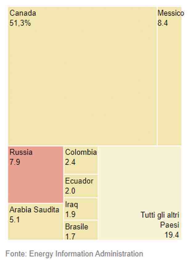 Gli Stati Uniti consumano molto più petrolio di quello che estraggono, richiedendo loro di importare alcune forniture. Ma è comunque meno dipendente dal petrolio russo rispetto all'Europa e prende solo una piccola parte del suo greggio importato dalla Russia.