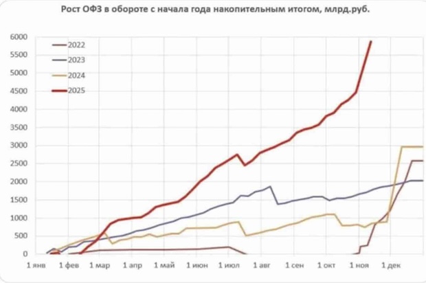 «Crescita delle OFZ (obbligazioni federali russe) in circolazione dall’inizio dell’anno, cumulata, miliardi di rubli»