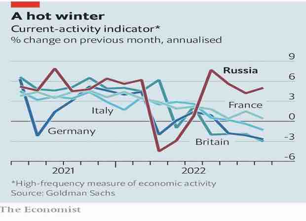 Nonostante questi problemi, la recessione, in Russia, è probabilmente giunta al termine. Molti, spesso, dubitano dei dati ufficiali del PIL comunicati da Mosca, ma è possibile avere un'idea dell'attività economica reale da una serie di fonti affidabili. La banca d’affari Goldman Sachs, produce un "indicatore di attività corrente", che segue l'andamento delle varie economie di mese in mese; e i suoi dati suggeriscono che l'attività russa sia più vivace che in altri grandi paesi europei (vedi grafico). Anche la produzione dell'industria automobilistica, che pochi mesi fa era praticamente scesa a zero, si è ripresa, suggerendo che i produttori si siano riforniti dall'esterno dell'Occidente. In termini di dollari, le importazioni mensili di merci da parte della Russia ora superano quasi sicuramente la media dell'anno scorso. Quindi quelli che ci rimettono sono i produttori europei.