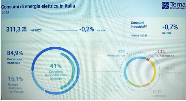 2025 stabile, pari al 2024. Secondo il Rapporto 2025 di Terna, nell’anno i consumi elettrici italiani sono di 311,3 TWh, un valore in pratica equivalente a quello del 2024. Lo scorso anno le fonti rinnovabili hanno coperto il 41% della domanda, rispetto al 42% del 2024. Tale risultato è la conseguenza di due effetti antitetici: il record annuale di produzione fotovoltaica, contro una produzione idroelettrica tornata a valori regolari rispetto all’elevata idraulicità registrata nel 2024.