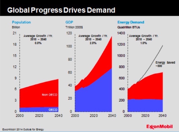 Secondo ExxonMobil, la domanda globale di petrolio e gas aumenterà del 13% entro il 2030 (anche per l’aumento di popolazione e l’aumento di nuove tecnologie consumatrici di energia). E questo tiene conto di recuperi di efficienza e risparmi, senza i quali la domanda di energia sarebbe doppia (ultimo grafico a destra).