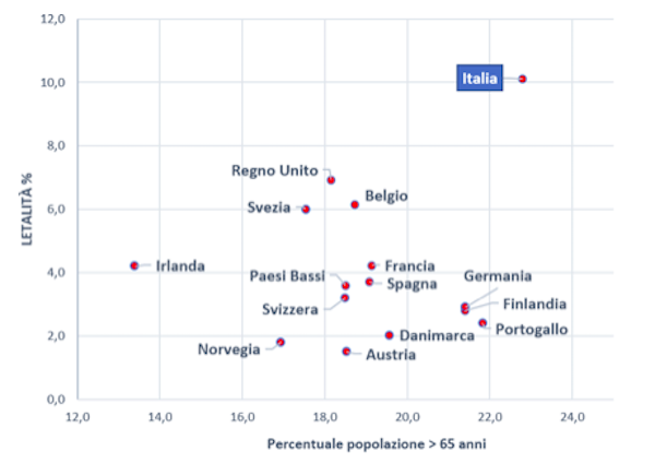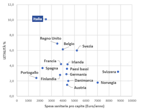 Forse è opportuno spiegare la differenza tra mortalità e letalità. La letalità è la percentuale di individui affetti da una certa malattia che sono deceduti per effetto di quella malattia. Se in Italia abbiamo avuto, ad oggi, circa 360.000 casi di infezione da SARS Covid 2 e i morti sono stati circa 36.000, la letalità è nell’ordine del 10%, La mortalità è invece la percentuale di popolazione totale che è deceduta per effetto di quella malattia. Quindi i 36.000 decessi su 60 milioni di abitanti danno una mortalità di 0,06%