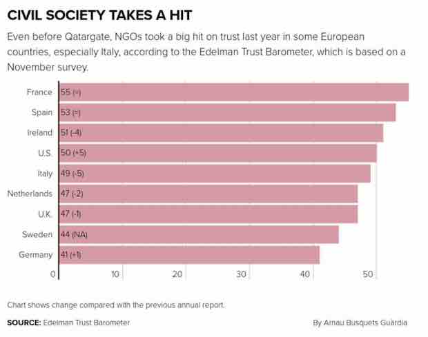 E quindi la fiducia dei donatori, nelle ONG, oggi sta diminuendo; e probabilmente le fa preoccupare del loro futuro. Questo è un grafico di quest’anno; e il commento al grafico ci ricorda che nel “Qatargate” sono coinvolte due ONG, come afferma “Repubblica”: