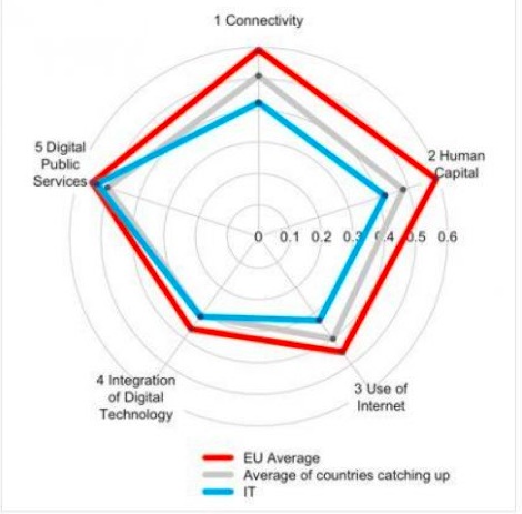Innanzitutto i grafici DESI illustrano il fatto che, nel capitale umano digitale, siamo non solo arretrati rispetto alla media europea, ma anche rispetto a quei paesi europei che si stanno sviluppando.